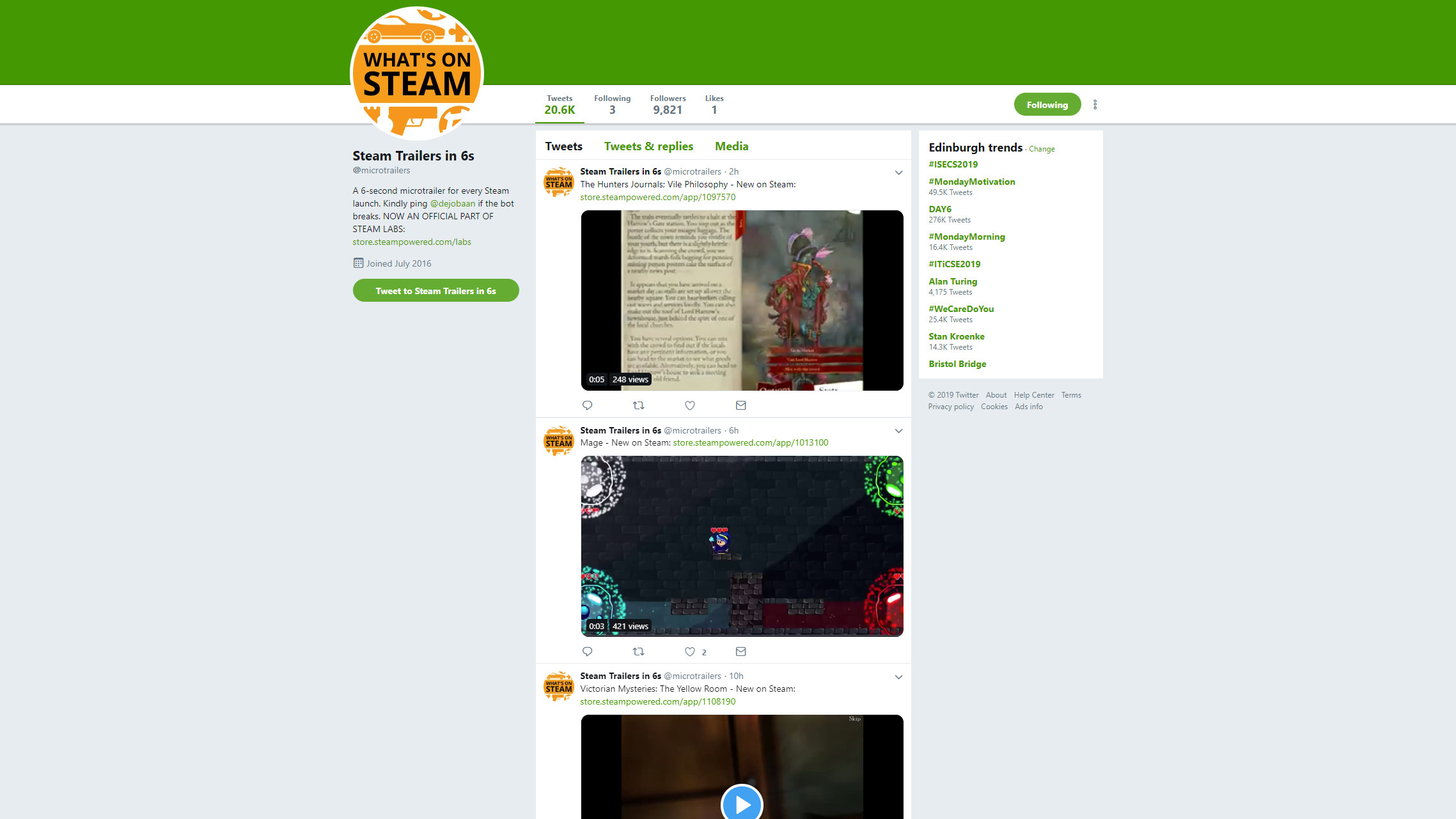 The best way to experience Steam’s torrent of new releases is @microtrailers, a Twitter bot which indiscriminately tweets about (most) launches with cut-down six-second versions of their trailers. With no curation and no adaptive algorithm, it gives a raw look at the range of modern games, the big-budget alongside the no-budget, the flashy alongside the plain, the serious war game alongside the horny anime puzzle game. It’s so great that Valve copied it for their Steam Labs experiments. Troublingly, when Valve launched their algorithmitated Micro Trailers last week, the original Twitter bot went down. Did they kill it to replace it with a worse version? Naw, relax! It was a technical hiccup and the Steamy treat is back, baby.